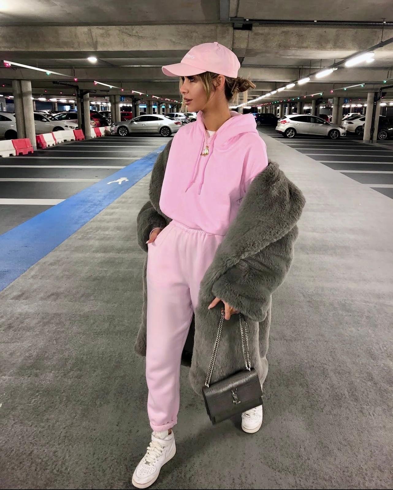 Pastel pink tracksuit styled with a faux fur coat and sneakers.