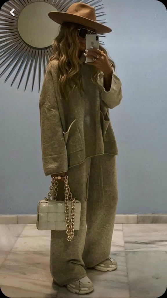 Cozy doesn’t have to mean casual only – this outfit proves that comfort and sophistication can go hand in hand. The oversized set creates a relaxed silhouette, balanced by the structure of bold accessories like the chain-detail bag and the wide-brim hat. Paired with chunky sandals and sleek sunglasses, the look transitions seamlessly from coffee runs to stylish city strolls. Minimal effort, maximum style – perfect for days when ease and elegance are equally important.