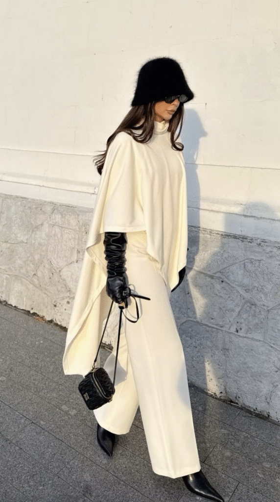 This look embraces fall elegance with flowing cream layers contrasted by sleek black details.
