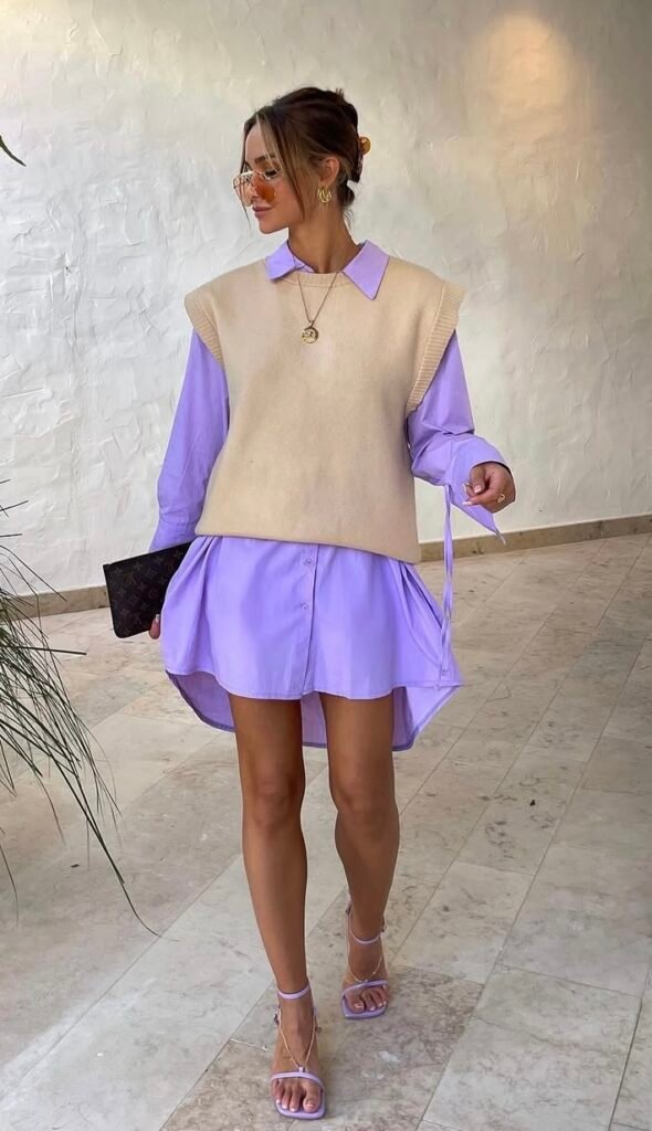 A playful pastel look featuring a yellow mini dress, a cropped lilac jacket, and white sneakers, finished with tinted sunglasses and a neutral bag for easy summer chic.