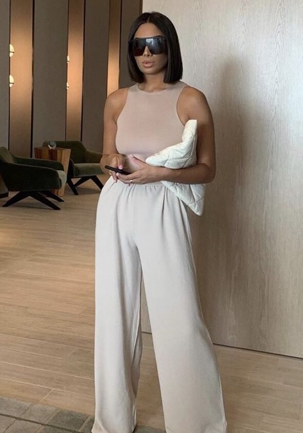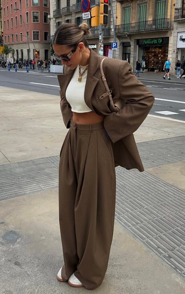 A soft grey knit styled with high-waisted, wide-leg brown trousers, completed with a black handbag and sleek sunglasses for effortless sophistication.