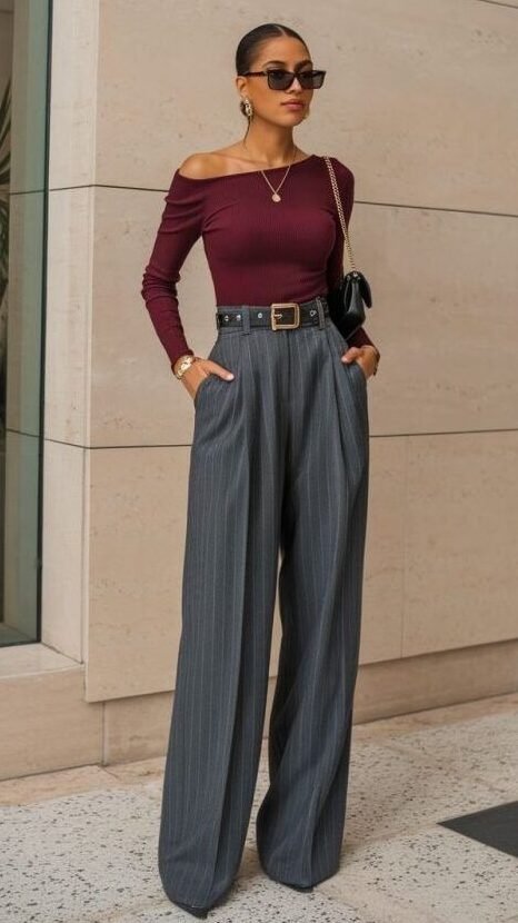 A clean yet striking look combining a ruched top with tailored wide-leg trousers.