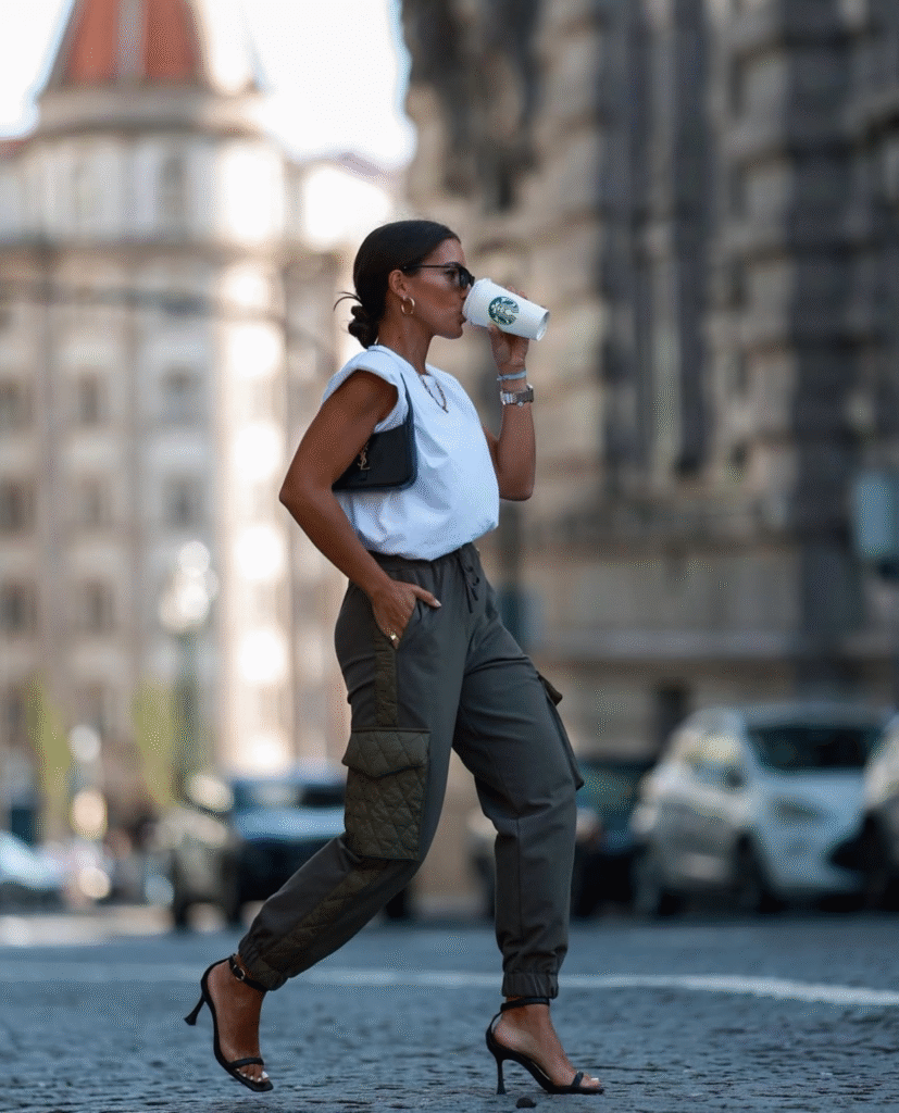 A sporty–urban look featuring a cropped white tee paired with striking black-and-white cargo pants.