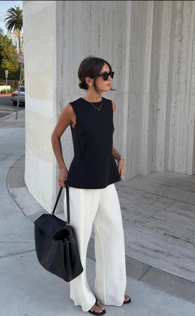 Crisp black and white tailoring with sleek lines for modern everyday polish.