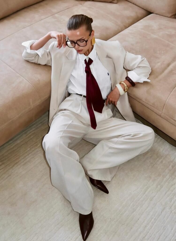 A sleek cream ensemble that balances sharp tailoring with soft elegance.