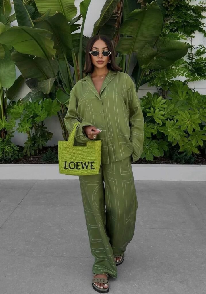 A tonal green set with relaxed tailoring and chic accessories for effortless cool.