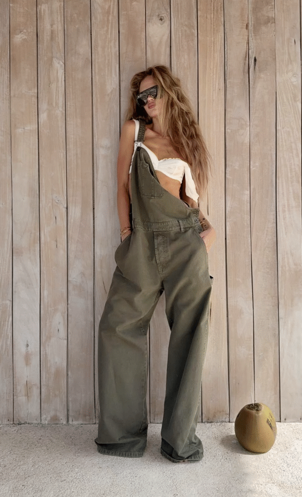 Relaxed olive overalls styled with a crisp white bandeau and oversized shades for effortless warm-weather chic.