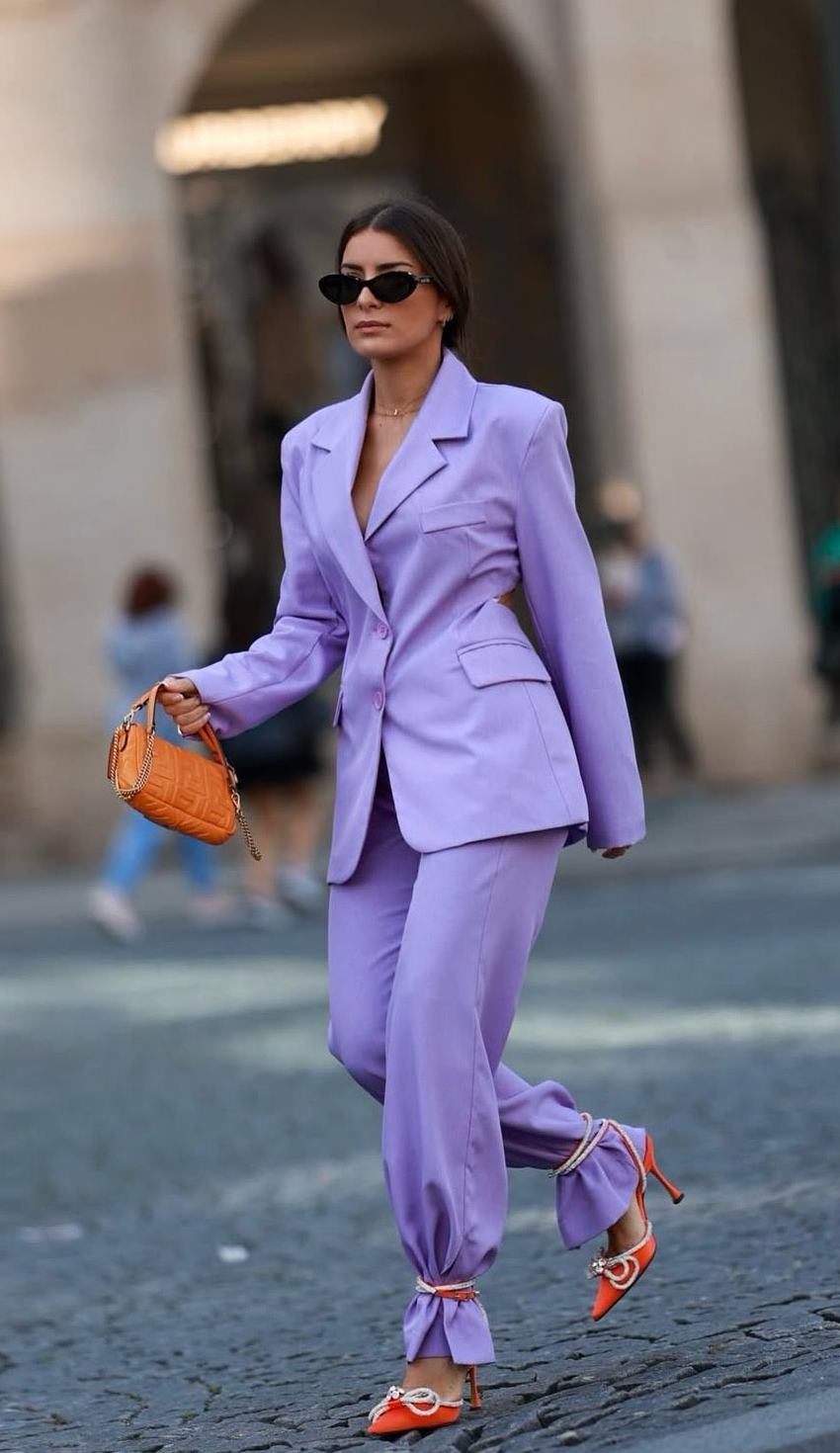 A sharp lilac suit redefines power dressing with modern freshness.