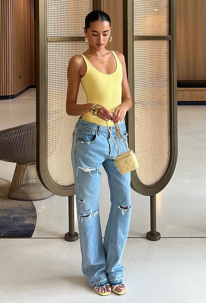 A vibrant yellow tank paired with ripped denim and effortless accessories for sunshine style made casual cool.