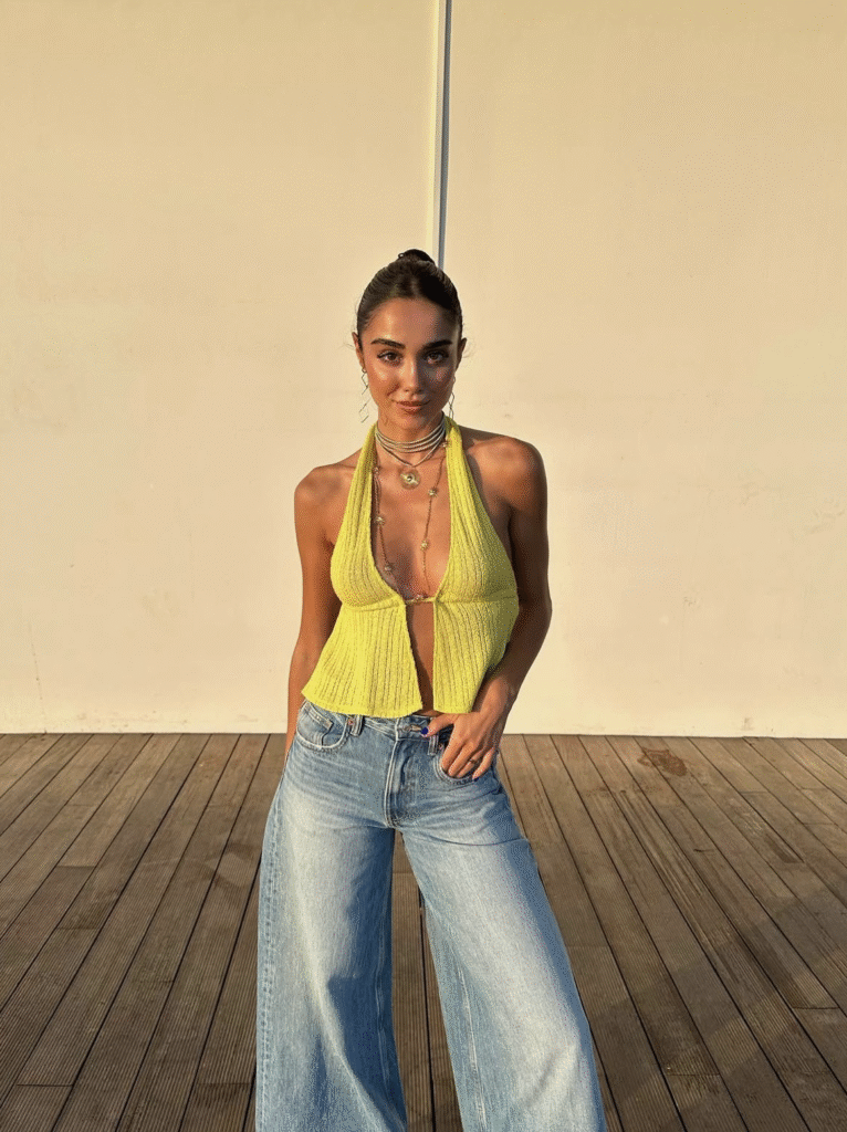 Playful charm meets casual cool with a vibrant yellow halter top and light-wash wide-leg jeans.