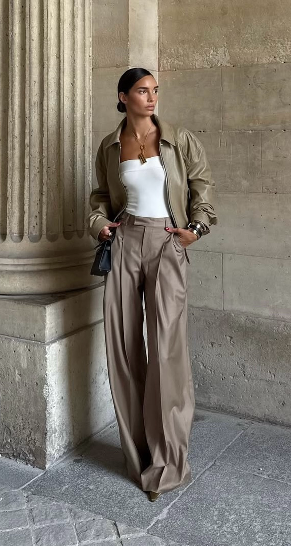 A sleek taupe look featuring wide-leg trousers, a leather jacket, crisp white top, gold accents, and a mini bag.
