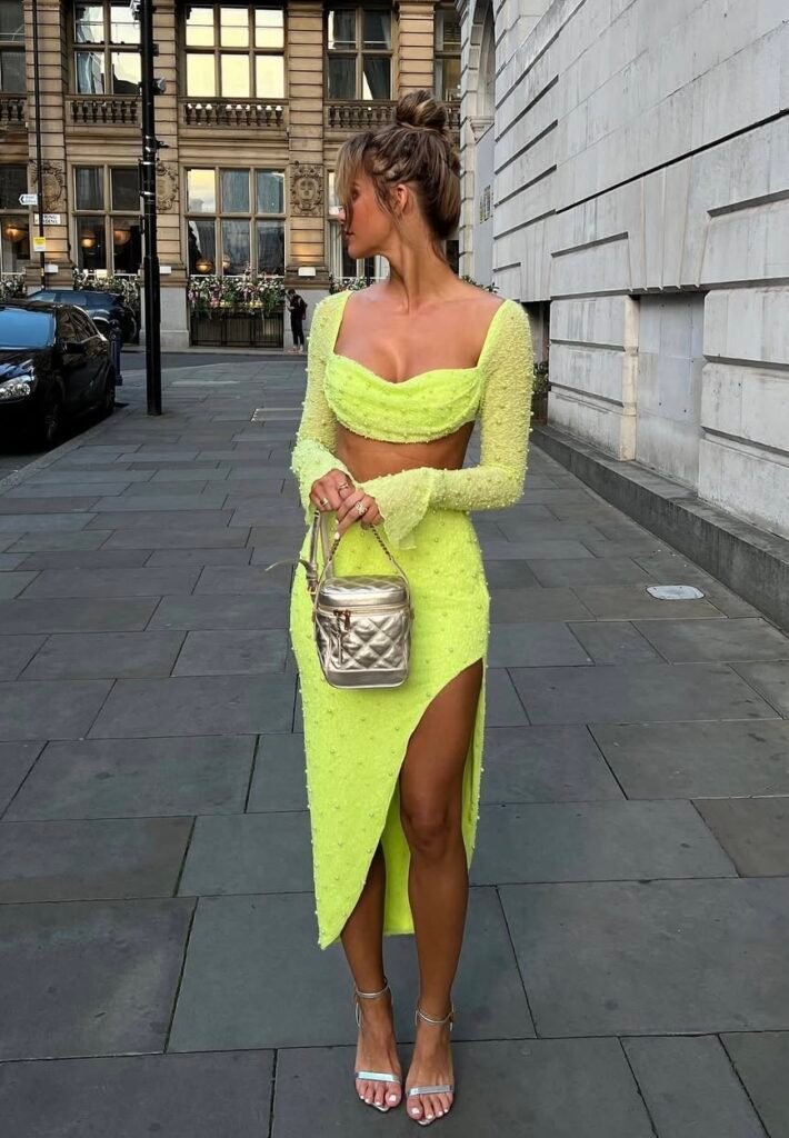This striking co-ord set in electric chartreuse demands attention with its vibrant hue and daring silhouette.