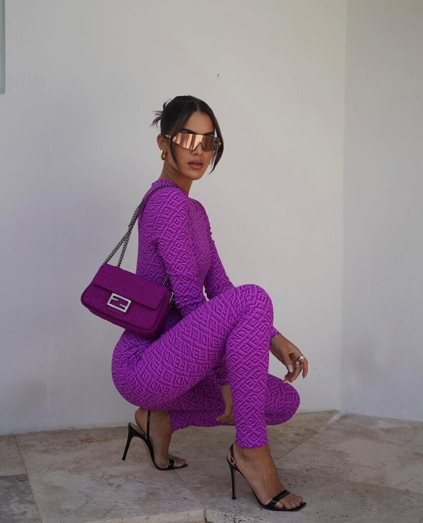 A monochrome power move in bold purple – this iconic ensemble is your passport to turning heads.
