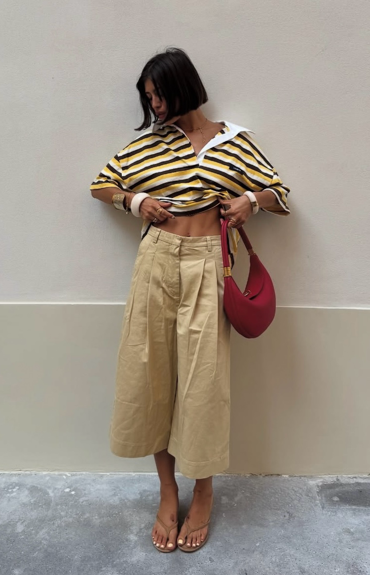 A striped blouse with beige culottes and a red bag for a chic Parisian vibe.