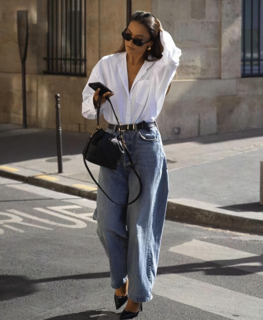 A crisp white shirt with relaxed denim styled with a sleek black belt, structured bag, and pointed heels for timeless Parisian chic.