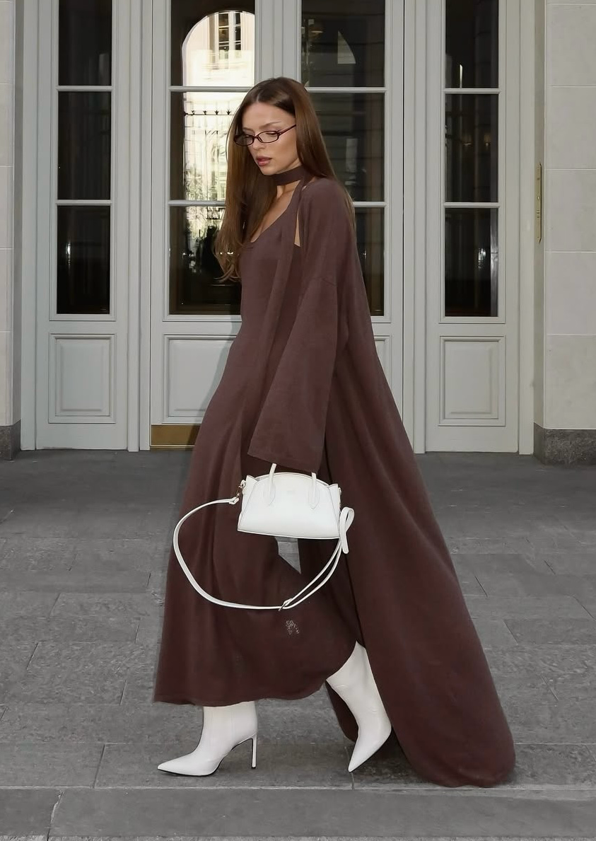 A relaxed cocoa maxi dress styled with white boots, a mini bag, and sleek glasses for effortless fall chic.