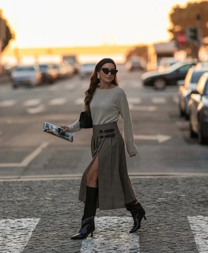 A beige knit paired with a check midi skirt featuring statement buckles and a daring slit.