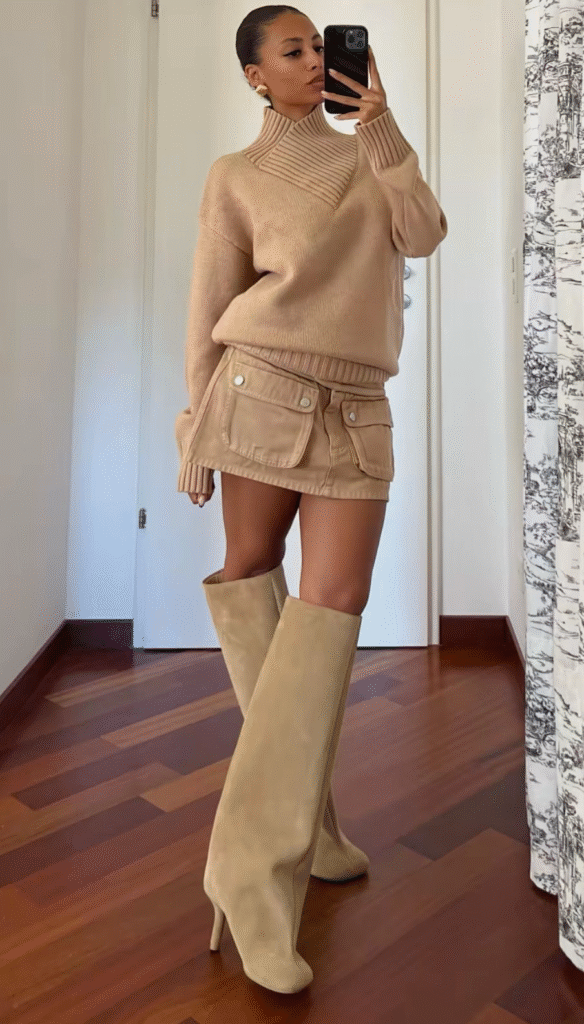 A chic monochrome look in camel tones with a cozy knit sweater, a utility-style mini skirt, and tall suede boots for effortless sophistication.