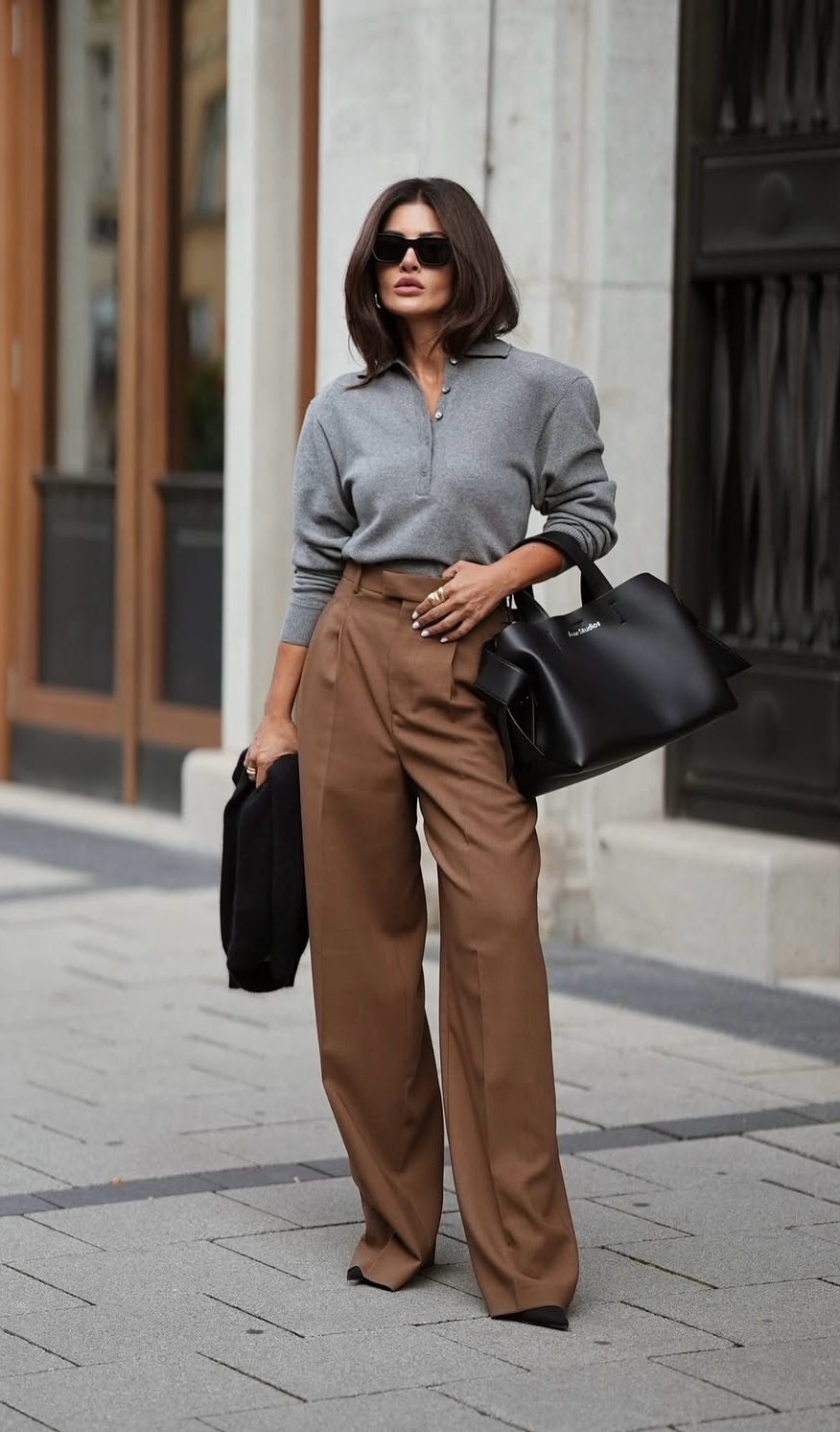 A soft grey knit styled with high-waisted, wide-leg brown trousers, completed with a black handbag and sleek sunglasses for effortless sophistication.