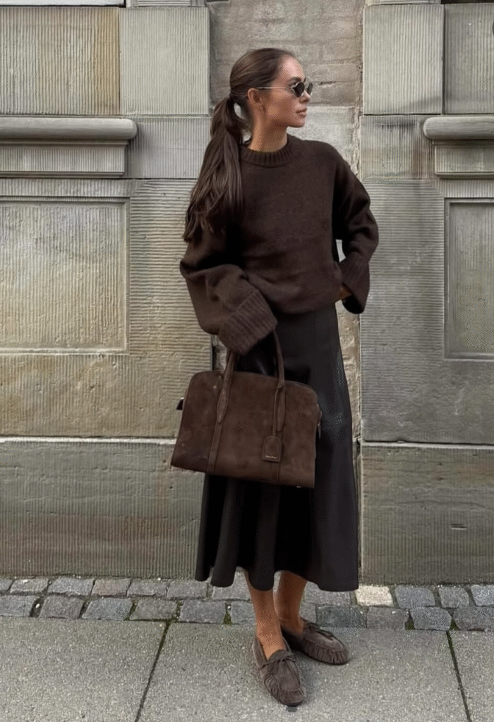 A cozy yet elevated brown monochrome look with a soft sweater, flowing midi skirt, suede loafers, and a structured bag for timeless fall chic.