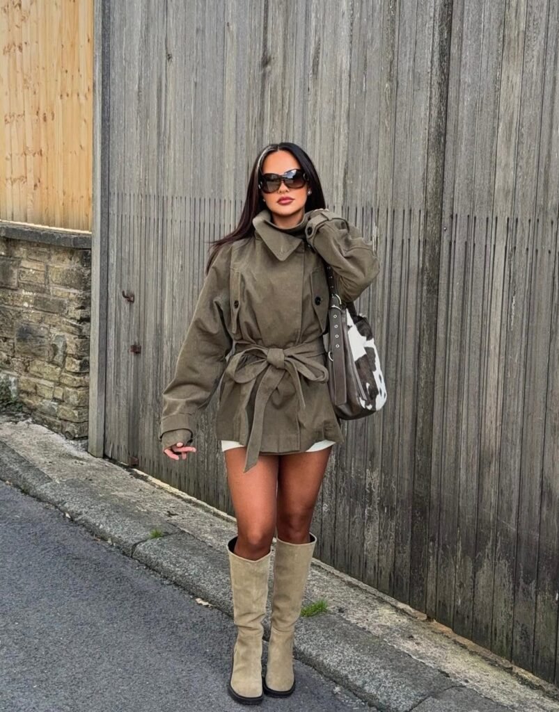 A belted khaki jacket styled as a mini dress, finished with tall suede boots and a cow-print bag for an urban chic twist.