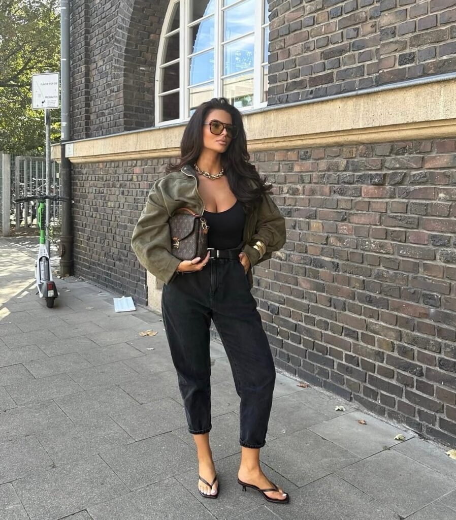 A sleek black base styled with an olive jacket, belted high-waist jeans and strappy heeled sandals.